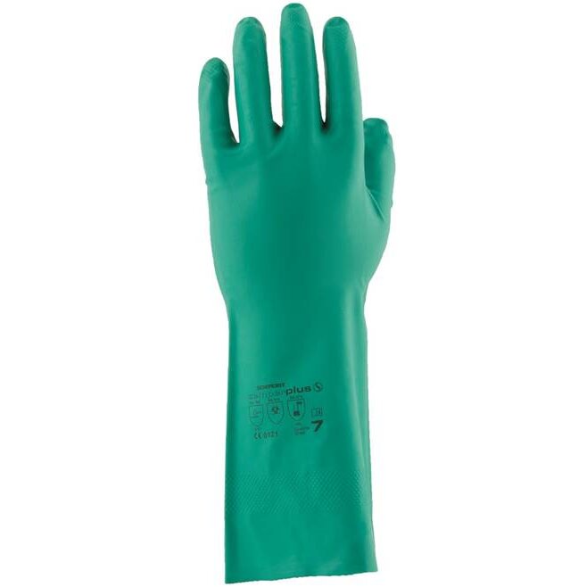 ochranné rukavice CE CAT. III vysoká mechanická odolnost, výborné ochranné vlastnosti nitrilu především pro manipulaci s chemikáliemi, vhodné do olejů pro většinu profesionálních čistících aplikací povrchová úprava pro snadnější a bezpečnější úchop tloušťka dlaně: 0,38 mm +- 0,05 mm délka: 330 +- 10 mm barva: zelená materiál: nitril velikosti: 6-10