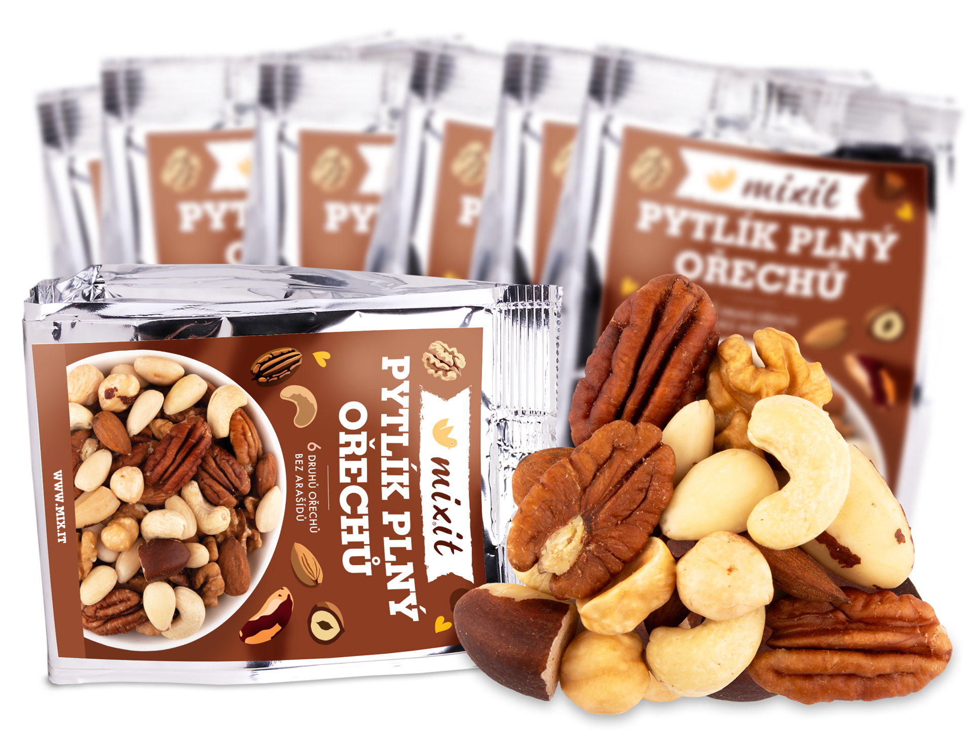 Pytlík plný ořechů tak, jak je příroda stvořila. Nekompromisně dobré bez čehokoliv navíc. 6 druhů ořechů, nově bez arašídů, potěší všechny, kteří se řídí heslem „hlavně přirozeně“. :-) Para ořechy, kešu, mandle, vlašské, lískové a pekanové ořechy. Dokonalá souhra chutí doplní energii a bílkoviny v práci, ve škole i na výletě. rychlá a křupavá energie s sebouprostě ořechy - co víc dodat? :-)