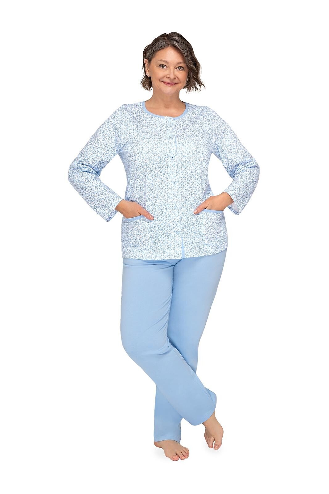 Piżama damska- wykonana z delikatnej bawełny- koszulka wzorzysta, zapinana na guziki- długi rękaw- po bokach naszyte kieszenie- spodnie długie, jednolite