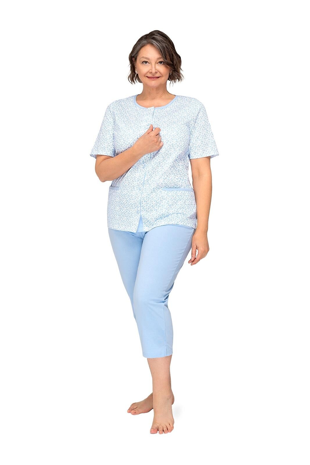 Piżama damska- wykonana z delikatnej bawełny- koszulka wzorzysta, zapinana na guziki- krótki rękaw- po bokach naszyte kieszenie- spodnie rybaczki, jednolite číst celé