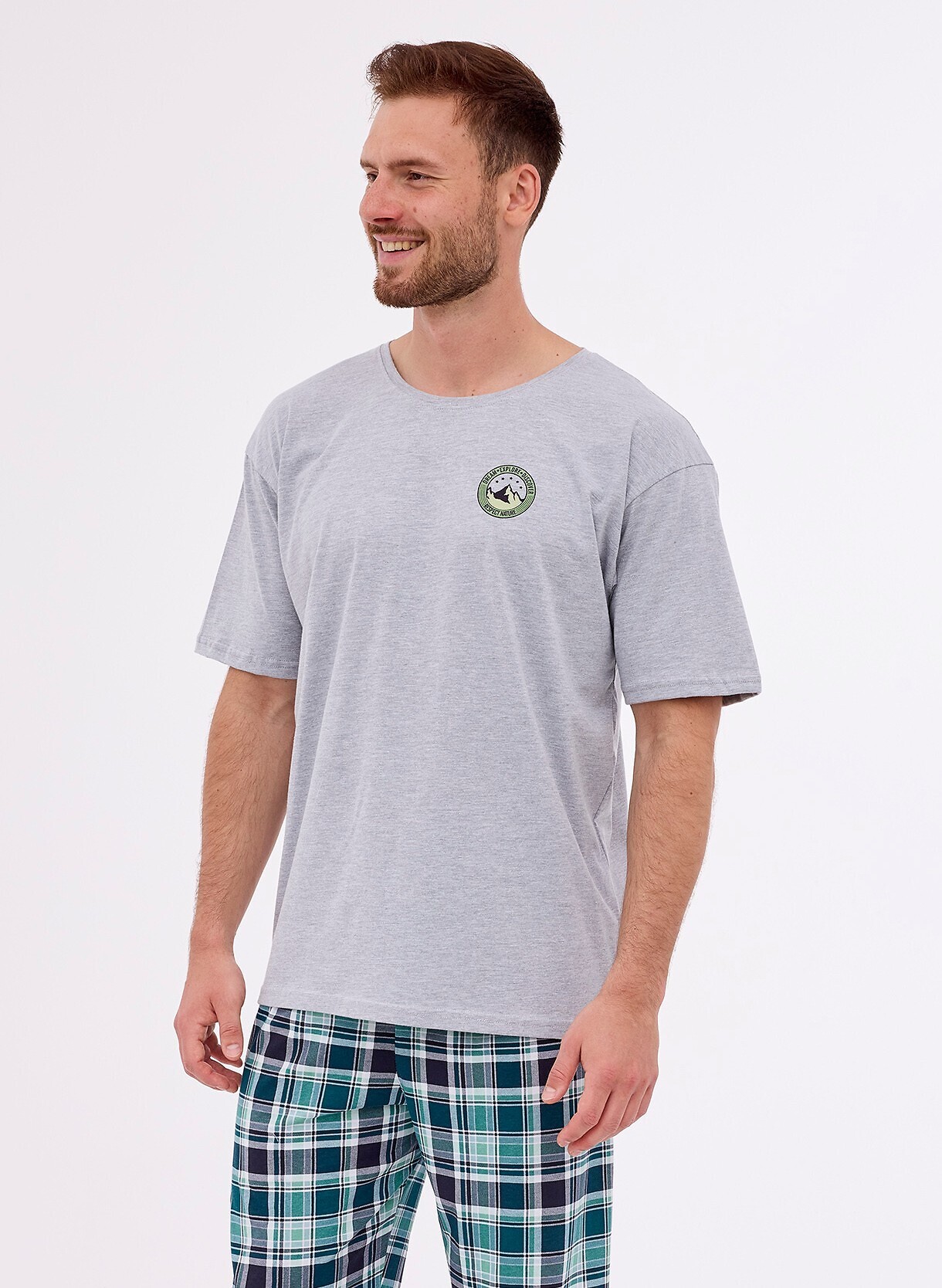 Piżama męska- koszulka z krótkim rękawem- półokrągły dekolt- na wysokości klatki piersiowej delikatny nadruk- długie spodnie w kratkę