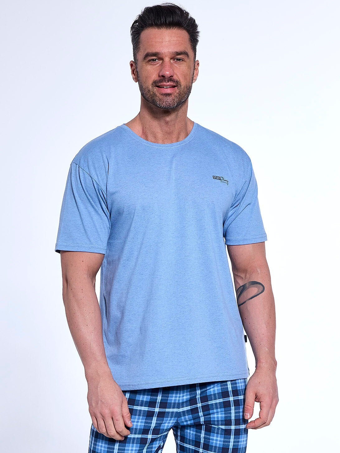 Bawełniana piżama męska- koszulka z krótkim rękawem- półokrągły dekolt- na piersi mały nadruk- długie spodnie w kratkę- w pasie gumka obszyta bawełną číst celé