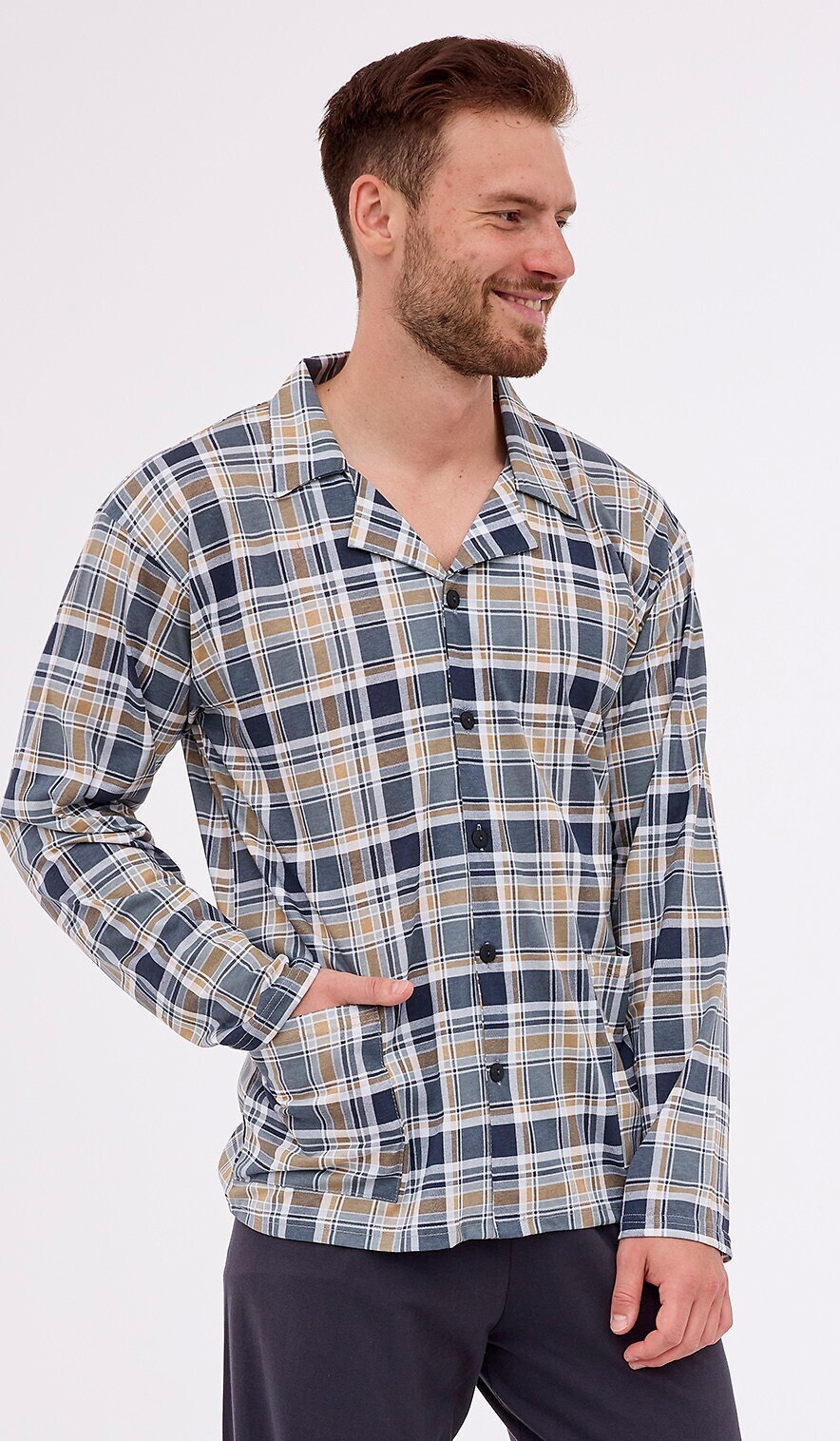 Piżama męska, rozpinana- wysoka jakość bawełny- bluza w kratkę, z długim rękawem- z kołnierzykiem, zapinana na guziki, z kieszeniami- spodnie długie, jednolite