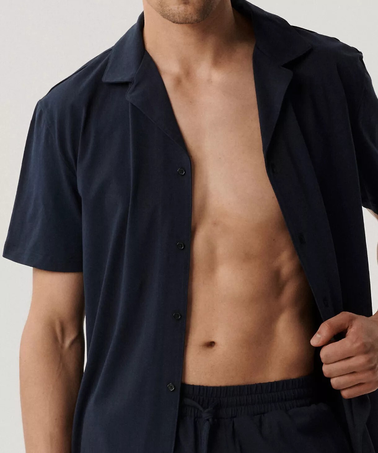Klasyczna piżama męska- miękka dzianina bawełniana- bluza z kołnierzykiem, z krótkim rękawem, zapinana na guziki- długie proste nogawki- w pasie szeroka, gładka guma obszyta bawełną, bez troczka- na biodrach wygodne kieszenie