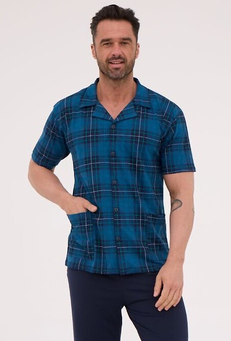 Piżama męska, rozpinana- wysoka jakość bawełny- bluza w kratę- krótki rękaw- z kołnierzykiem, z kieszeniami- spodnie długie, jednoliteSkład: 100% bawełna číst celé