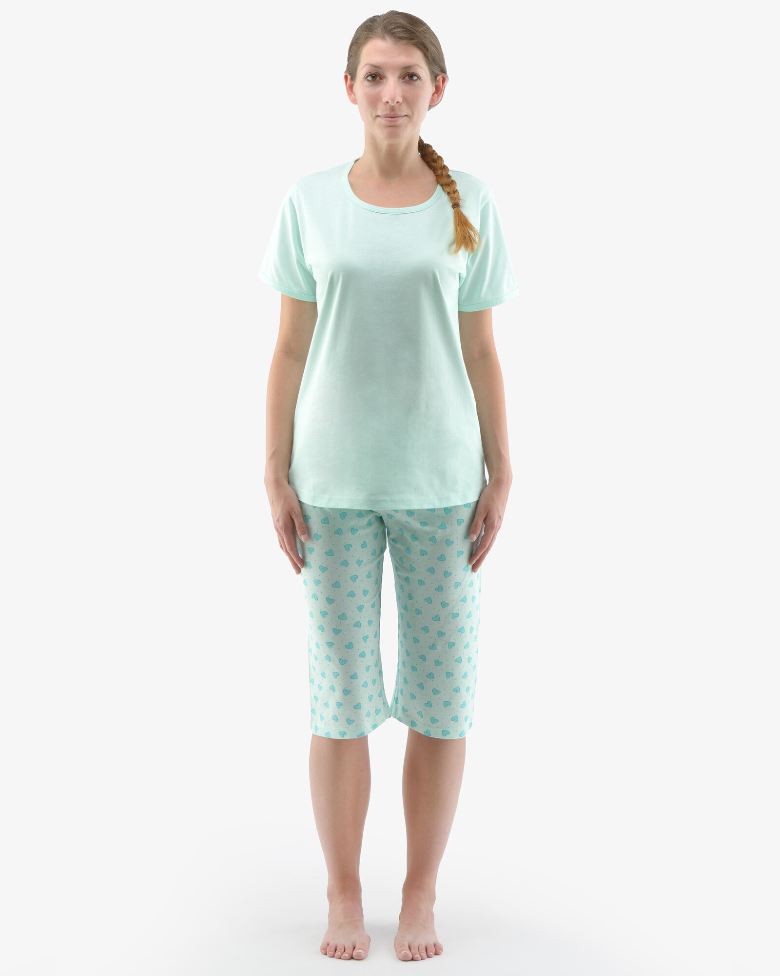 Dámské pyžamo Gina ocení každá žena, která má ráda pohodlí, jak v létě, tak v zimě. Pyžamo se skládá z trička s krátkými rukávy a dlouhých spodních kalhot. Vyrobeno je ze 92% bavlny a 8% elastanu.