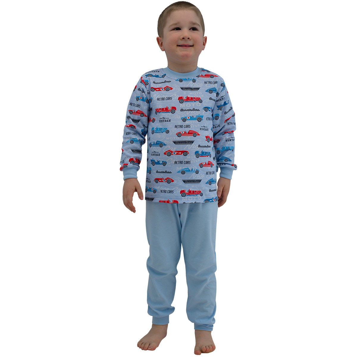 Popis: - Bavlněné dětské pyžamo s potiskem Retro cars. Světlá modrá barva jako podklad s barevnými auty. Dětské pyžamo je tedy vhodné pro chlapce. - Pružný úplet okolo krku, rukávů a kotníků díky kterému se pyžamo pohodlně nosí a přitom nepadá ani netlačí. - V pase má dětské pyžamo vyměnitelnou gumu s ideální šířkou pro spaní bez otlaků. - Díky kvalitnímu materiálu si pyžamo drží stále stejný tvar.