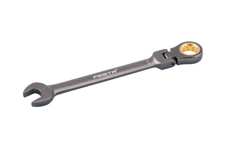 Ráčnové klíče FESTA s kloubem pro použití pod úhlem s výhodou rohatky (ráčny) jsou vyrobeny kováním z kvalitní chromvanadiové oceli. Tato ocel povrchově upravená matným tvrdochromem pro dosažení optimální povrchové tvrdosti a odolnosti vůči korozivním vlivům. Rohatku ráčny klíče tvoří 72 kalených zubů, záběr po 5-ti obloukových stupních. Kvalitou, tvrdostí a přesností přesně odpovídají normě DIN/ISO.