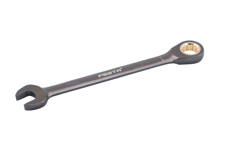 ráčnové klíče FESTA jsou vyrobeny kováním z kvalitní chromvanadiové oceli ocel povrchově upravená matným tvrdochromem pro dosažení optimální povrchové tvrdosti a odolnosti vůči korozivním vlivům rohatku ráčny klíče tvoří 72 kalených zubů, záběr po 5-ti obloukových stupních kvalita, tvrdost a přesnost klíčů odpovídá normě DIN/ISO