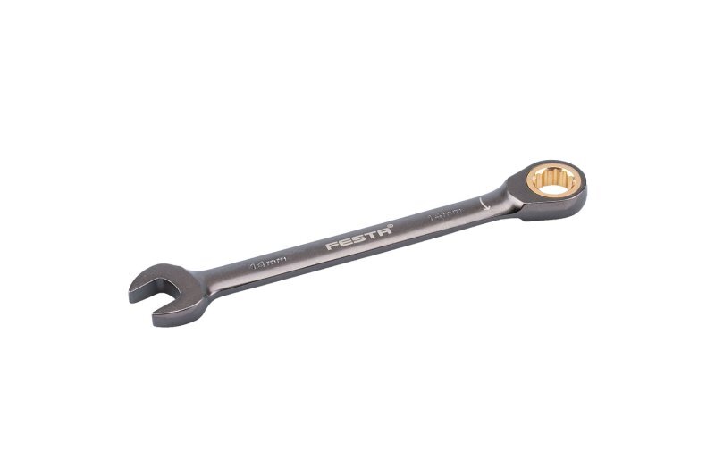 ráčnové klíče FESTA jsou vyrobeny kováním z kvalitní chromvanadiové oceli ocel povrchově upravená matným tvrdochromem pro dosažení optimální povrchové tvrdosti a odolnosti vůči korozivním vlivům rohatku ráčny klíče tvoří 72 kalených zubů, záběr po 5-ti obloukových stupních kvalita, tvrdost a přesnost klíčů odpovídá normě DIN/ISO
