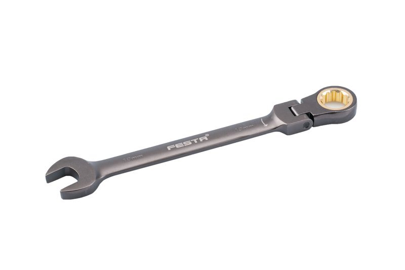 Ráčnové klíče FESTA s kloubem pro použití pod úhlem s výhodou rohatky (ráčny) jsou vyrobeny kováním z kvalitní chromvanadiové oceli. Tato ocel povrchově upravená matným tvrdochromem pro dosažení optimální povrchové tvrdosti a odolnosti vůči korozivním vlivům. Rohatku ráčny klíče tvoří 72 kalených zubů, záběr po 5-ti obloukových stupních. Kvalitou, tvrdostí a přesností přesně odpovídají normě DIN/ISO.
