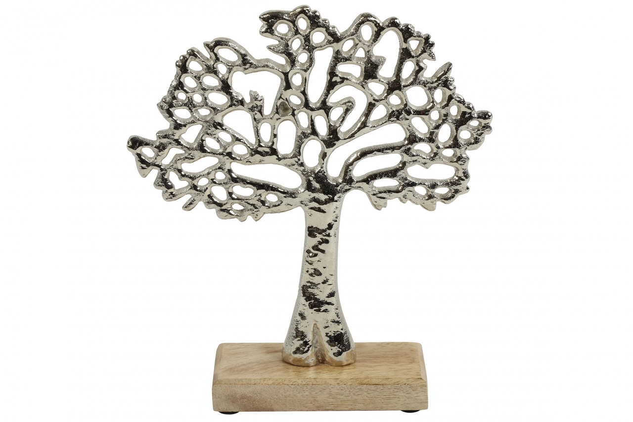 Dekorativní kovový strom života na dřevěném podstavci.