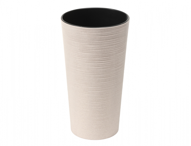 Tento vysoký plastový obal o průměru 25 cm a výšce 47 cm je vybaven vnitřní vložkou, která zajišťuje praktické použití bez nutnosti dalších úprav. Výrobek je vyroben z recyklovaného plastu obsahujícího až 40 % dřevěných štěpek, což mu dodává jedinečnou texturu a barvu, a zároveň podporuje udržitelnost. Odolnost vůči UV záření zaručuje dlouhodobou životnost na slunci bez nežádoucího poškození materiálu.