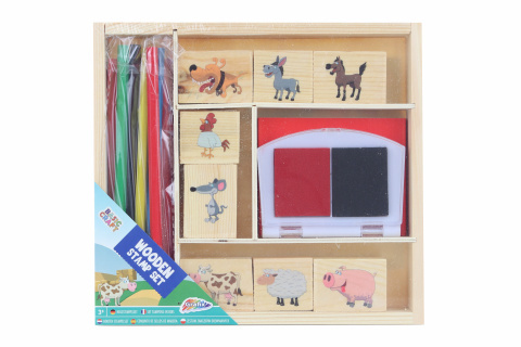 Razítka v dřevěné krabiččce s motivem zvířátek. Balení obsahuje 8 razítek, pastelky a houbičky k otisku. Rozměr balení 22x20x3,5 cm. Věk 3+ číst celé