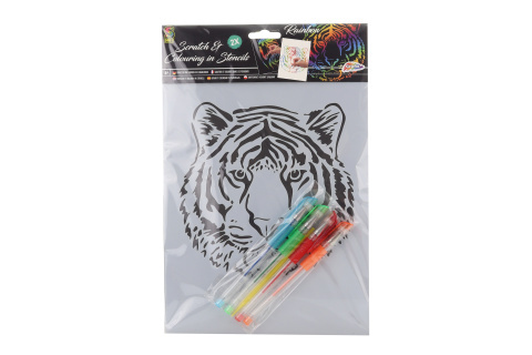 Balení obsahuje 2 šablony - koně a tygra A5 ,bílé papíry na obkreslování a černé a vyškrabování.Věk 3+ číst celé