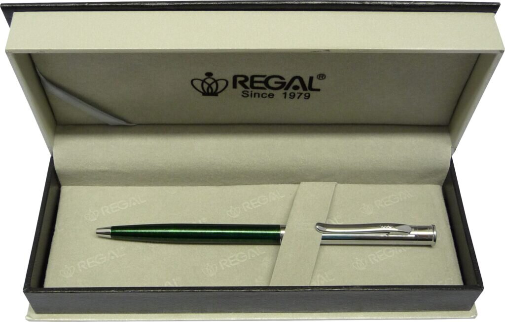 Pero je vybaveno otočným mechanismem pro snadné vysunutí náplně a výměnu dle potřeby. Jeho lesklé barevné kovové tělo v kombinaci se stříbrnými doplňky působí velmi elegantně a dodá vašemu psaní prestižní nádech. Dodává se s modrou náplní, která je vhodná jak pro běžné, tak i profesní použití. Praktickým bonusem je dárková krabička, ve které je pero uloženo, a také dárková taška Regal - ideální pro osobní i firemní dárky.