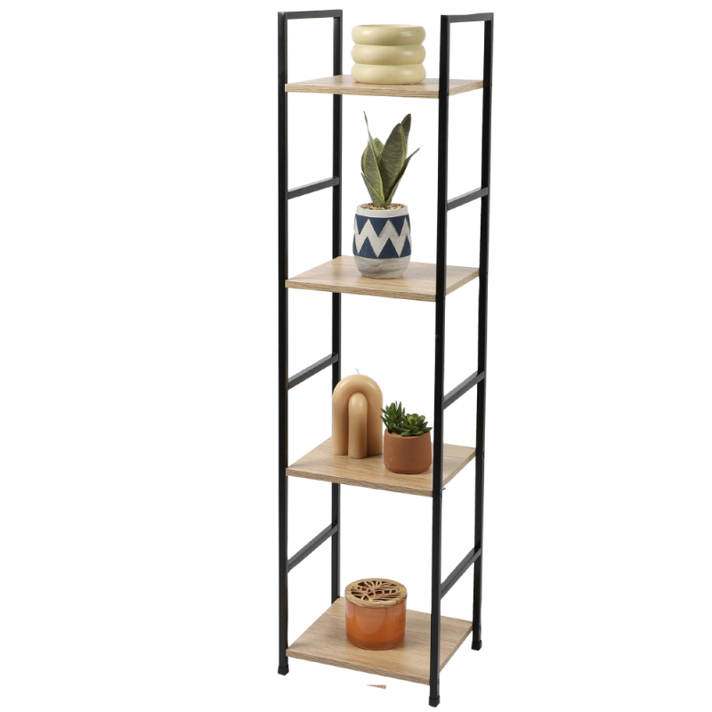 Tento policový regál spojuje moderní kovovou konstrukci v černé barvě s teplým dekorem dubu na policích, což vytváří nadčasový vzhled vhodný do různých interiérů. Se svými čtyřmi policemi nabízí dostatek prostoru nejen pro knihy, ale i dekorace, kancelářské potřeby či drobné domácí předměty. Jeho kompaktní rozměry 29 x 23,5 x 112 cm šetří místo, přitom však poskytují stabilní a pevnou oporu díky kovové konstrukci.