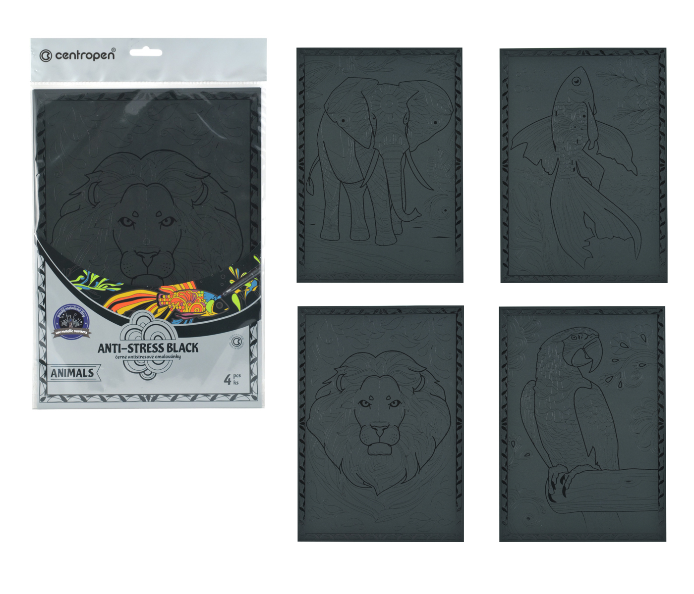 Tato souprava obsahuje čtyři omalovánky formátu A4 s motivy zvířat, přičemž vybarvením pomocí metalických popisovačů dosáhnete krásných, výrazných a zářivých obrázků. Kvalitní černý papír je potažen transparentním lakem, který zvýrazní každý tah a dodá vašemu umění jedinečný efekt. Souprava je ideální pro všední chvíle odpočinku, kreativní relaxaci nebo jako originální dárek pro malé i velké umělce.
