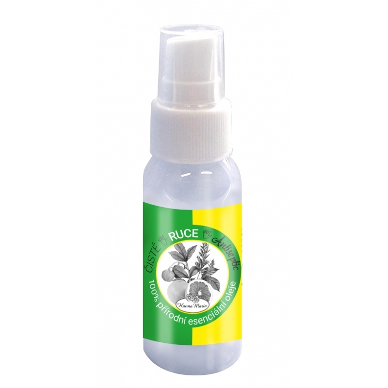 ANTISEPTIC - HYGIENICKÝ ČISTIČ NA RUCE - ve spreji. Bez použití vody a mýdla s extraktem z jitrocele a glycerinem. Desinfikuje, hydratuje a vyživuje namáhanou pokožku. Roztok ničí 99,9% virů, bakterií a plísní. Složky esenciálních olejů mají významný antibakteriální a antiseptický efekt, zacelují poškozenou strukturu pokožky, působí jako přírodní antibiotikum.