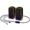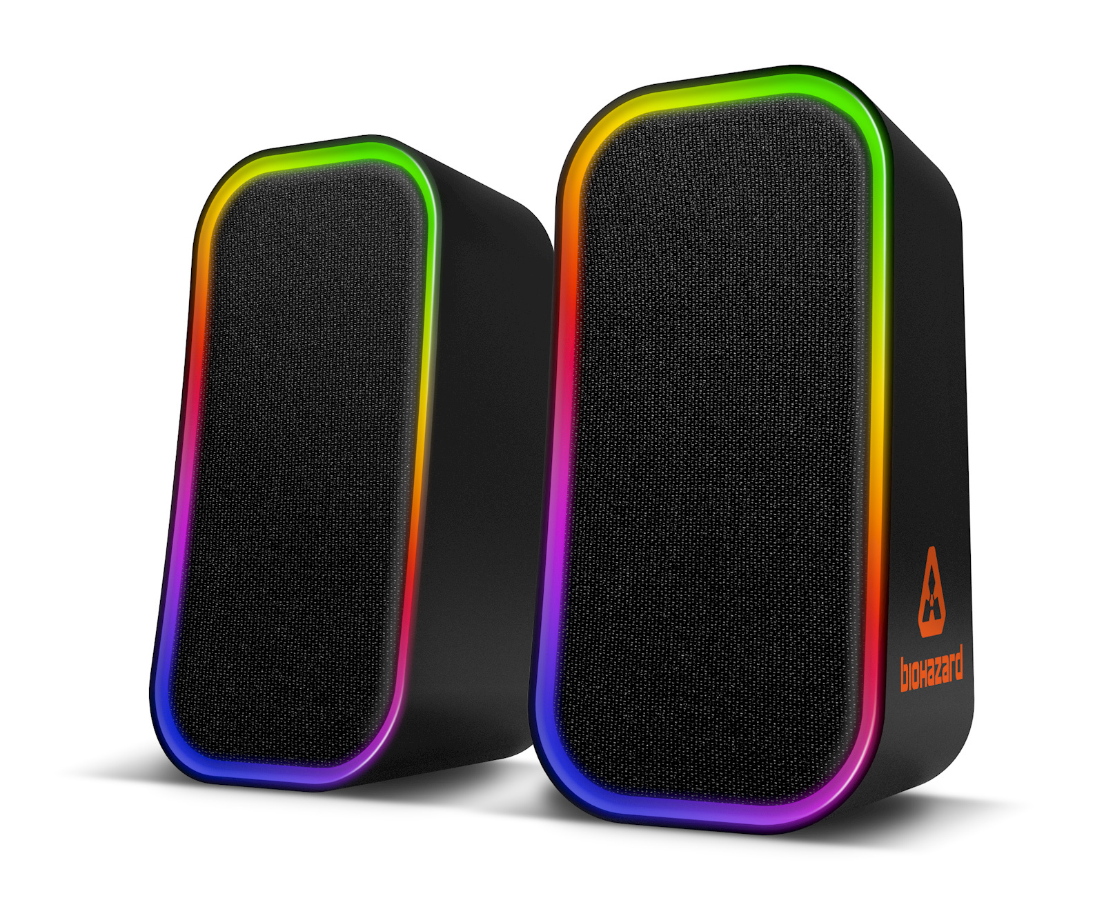 Gamingové reproduktory BIOHAZARD pro hráče počítačových her s připojením pomocí bluetooth nebo AUX vstupem. Reproduktory jsou vybaveny RGB Rainbow podsvícením a ovládáním hlasitosti/podsvícení/vstupu na kabelu.