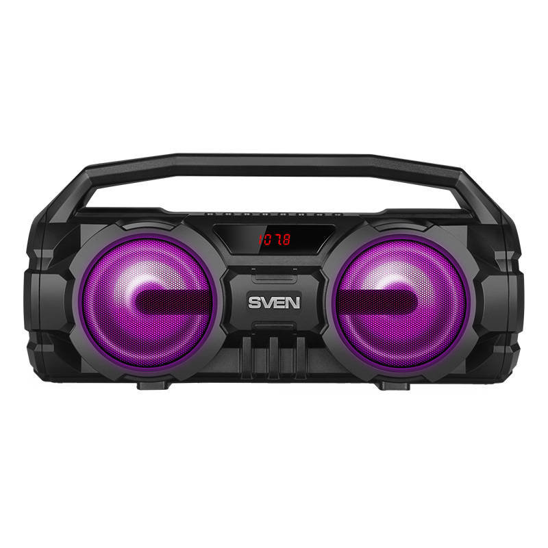 Host a party anywhere. SVEN PS-415 speaker is equipped with 2 drivers - each with a diameter of 70 mm. Thanks to them it can work in a wide frequency range from 100 to 20,000 Hz. The device is distinguished by its compact size and weighs just over a kilogram. A practical handle makes it easy to carry and transport. The built-in 1,500 mAh battery provides up to 10 hours of operation, and the dynamic backlight with several modes will help create the right mood. The device can work wired or wirelessly thanks to Bluetooth technology. It also supports USB drives and micro SD cards. It is also equipped with a built-in FM radio. Operation is facilitated by an LED display. In addition, by connecting the microphone to the dedicated input, you can enjoy home karaoke!