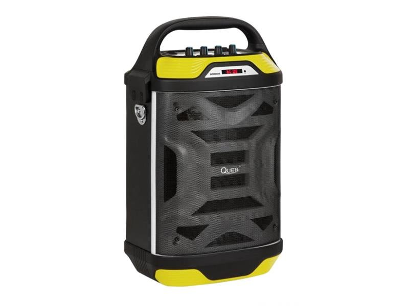 Přenosný aktivní reproduktor Quer s funkcí MP3, Bluetooth, FM rádio a karaoke je ideální pro společenské akce. S 1800 mAh baterií vydrží v provozu více než 2,5 hodiny bez nutnosti nabíjení. Zařízení si pamatuje 60 rozhlasových stanic a vaše oblíbená hudba může být přehrávána nejen bezdrátově přes Bluetooth, ale také z paměti USB nebo microSD. K dispozici je také mikrofon a dálkové ovládání. Sada je kompaktní a lehká, a umožňuje snadné přenášení.