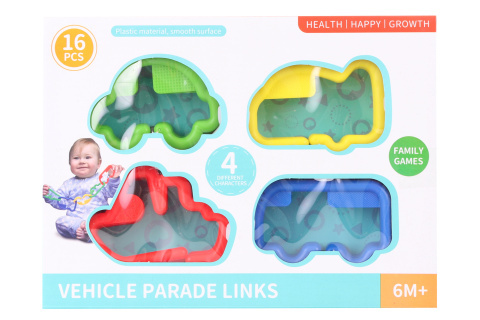 Plastový propojovací řetěz na kočárek. Dílky mají tvar dopravních prostředků. Balení obsahuje 16 dílků. Rozměry balení cca 24 x 18 x 4 cm. Věk 6m+ číst celé