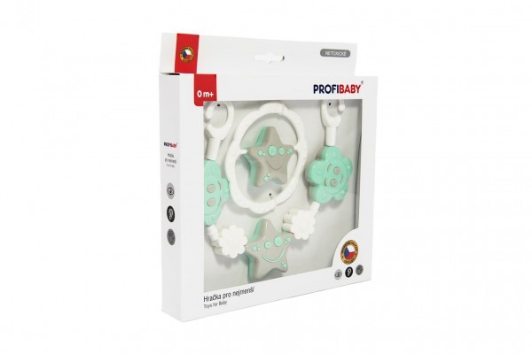 Souprava chrastítko řetěz na kočárek +chrastíko hvězdička/kytička šedo/růžové, šedo zelené, šedo/bílé nebo pestrobarevné. V odzdobné krabičce. Vyrobeno v ČR, splňuje hygienické normy EU.