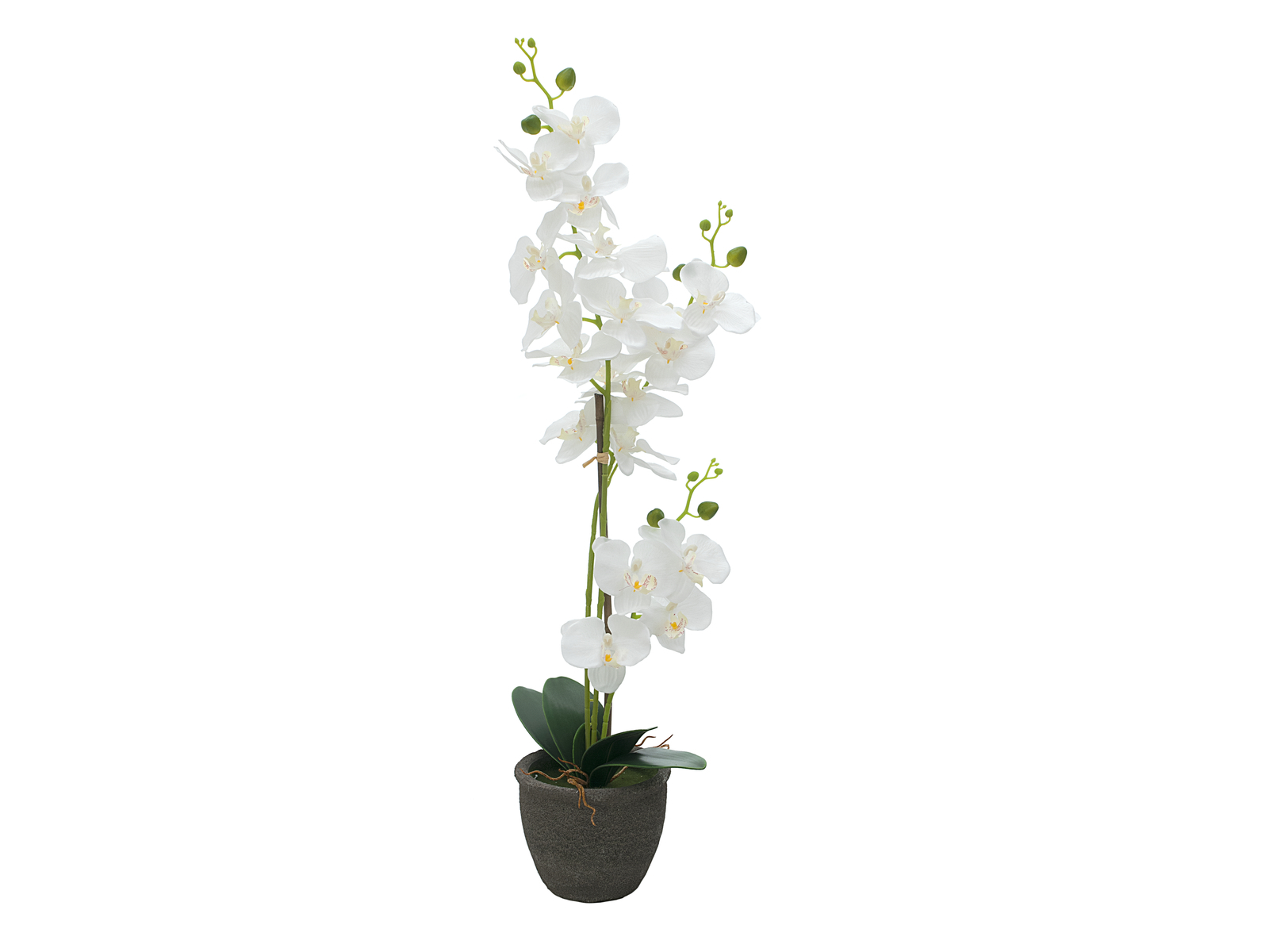 Umělá orchidej k nerozeznání od živé rostliny. Výška cca. 80 cm, 3 oddělené stonky jsou posety textilními květy ve sněhobílé barvě, které mají voskový povrch a na dotek tak věrně imitují skutečnou květinu. Ve špičkách stonků jsou umístěné zelené pupeny, z květináče pak vyrůstají zelené listy a konce kořínků rostliny. Orchidej je dodávána v okrasném květináči s průměrem cca 16 cm. Skvělá dekorace do každého interiéru. Na rozdíl od skutečné rostliny nevyžaduje optimální světelné podmínky, nevadí jí průvan ani změny teplot, nemusíte řešit zavlažování ani další nezbytnou péči. Ideální doplněk na okno, na polici či pracovní stůl, do kanceláře, do čekárny, na prodejnu apod.