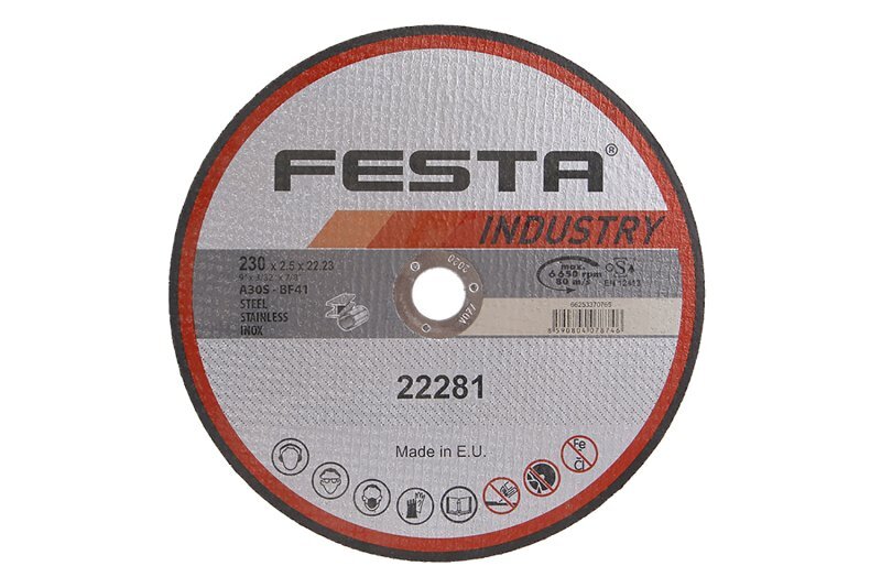 Profesionální řezný kotouč na kov, litinu, NEREZ. Vyrobeno v EVROPĚ!, řada kotoučů FESTA INDUSTRY je, jak již z názvu vyplývá určena zejména pro profesionální použití, kvalita ověřená reálnými zkouškami zaměřenými na počet a rychlost řezů. Druh zrna - KORUND, pojivo - syntetické pryskyřice na bázi aldehydu, provedení - ROVNÝ, max. pracovní rychlost - 80 m/s, max. přípustné otáčky - 12200 ot/min, PRO ZVÝŠENÍ PEVNOSTI ARMOVÁNO DVOUVRSTVOU SKLOTEXTILNÍ VLOŽKOU! KOTOUČE FESTA INDUSTRY SPLNUJÍ EN 12413 a homologaci OSA!