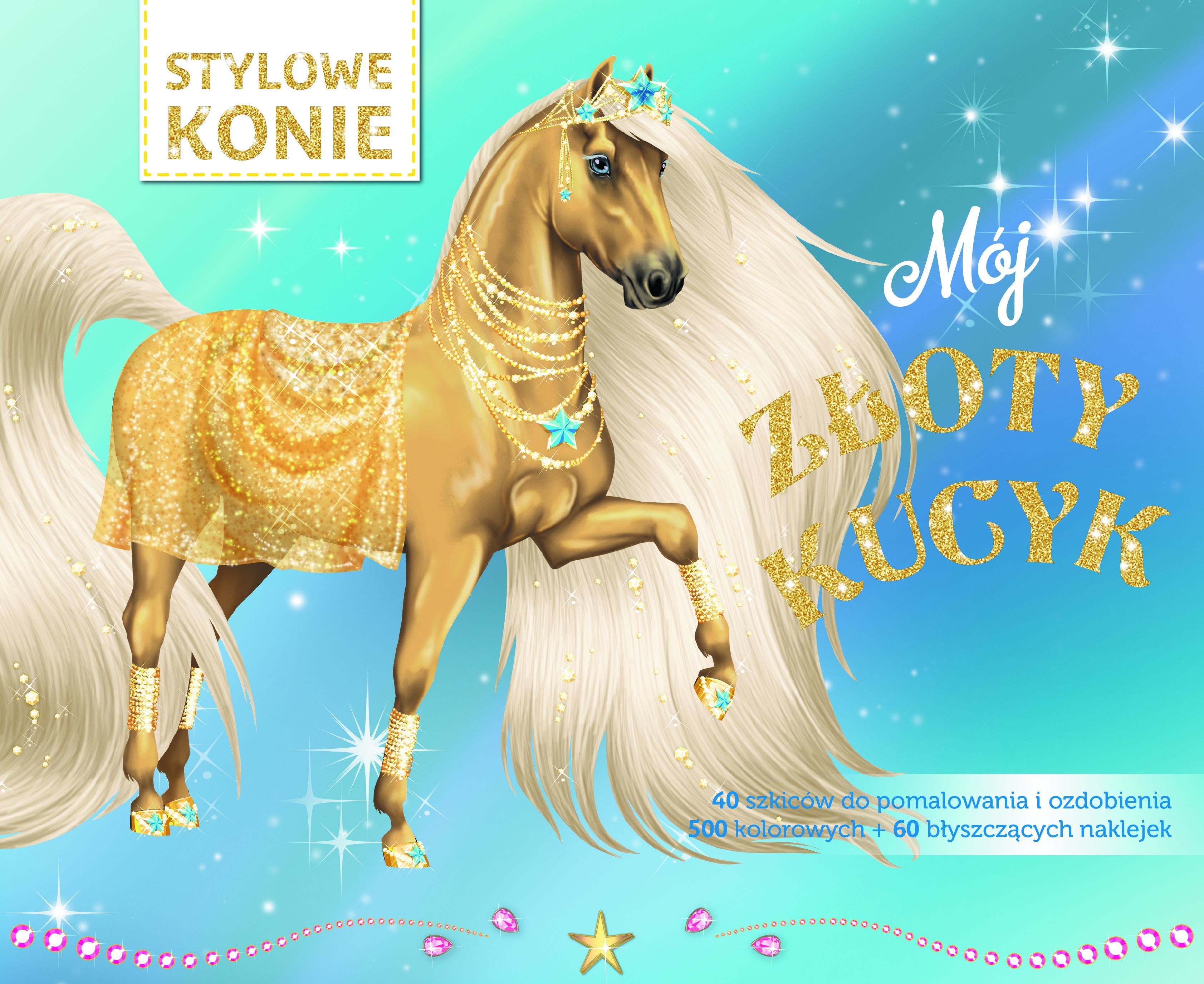 Ta śliczna książka zawiera aż 590 kolorowych naklejek (w tym 60 błyszczących!), a także 40 szkiców przedstawiających sylwetki przepięknych koników do pokolorowania i ozdobienia. Zapewnia wspaniałą, twórczą zabawę na długie godziny.Stwórz niepowtarzalnego kucyka, który rozbłyśnie jak najczystsze...