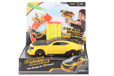 Plastové auto, které lze přeměnit na pistoli, která střílí pěnové náboje. Součástí balení jsou 4 náboje. Rozměry auta cca 18,5 x 7,5 x 5,5 cm. Rozměry balení cca 22 x 24 x 11,5 cm. Věk 5+