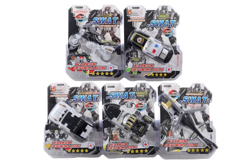 Rozkládací robot policie. 5 druhů - možno složit do auta, lodě, motorky, letadla nebo jeepu. Materiál plast. Rozměry balení 19x23x4 cm. Dodáváme dle skladové dostupnosti. Věk 3+