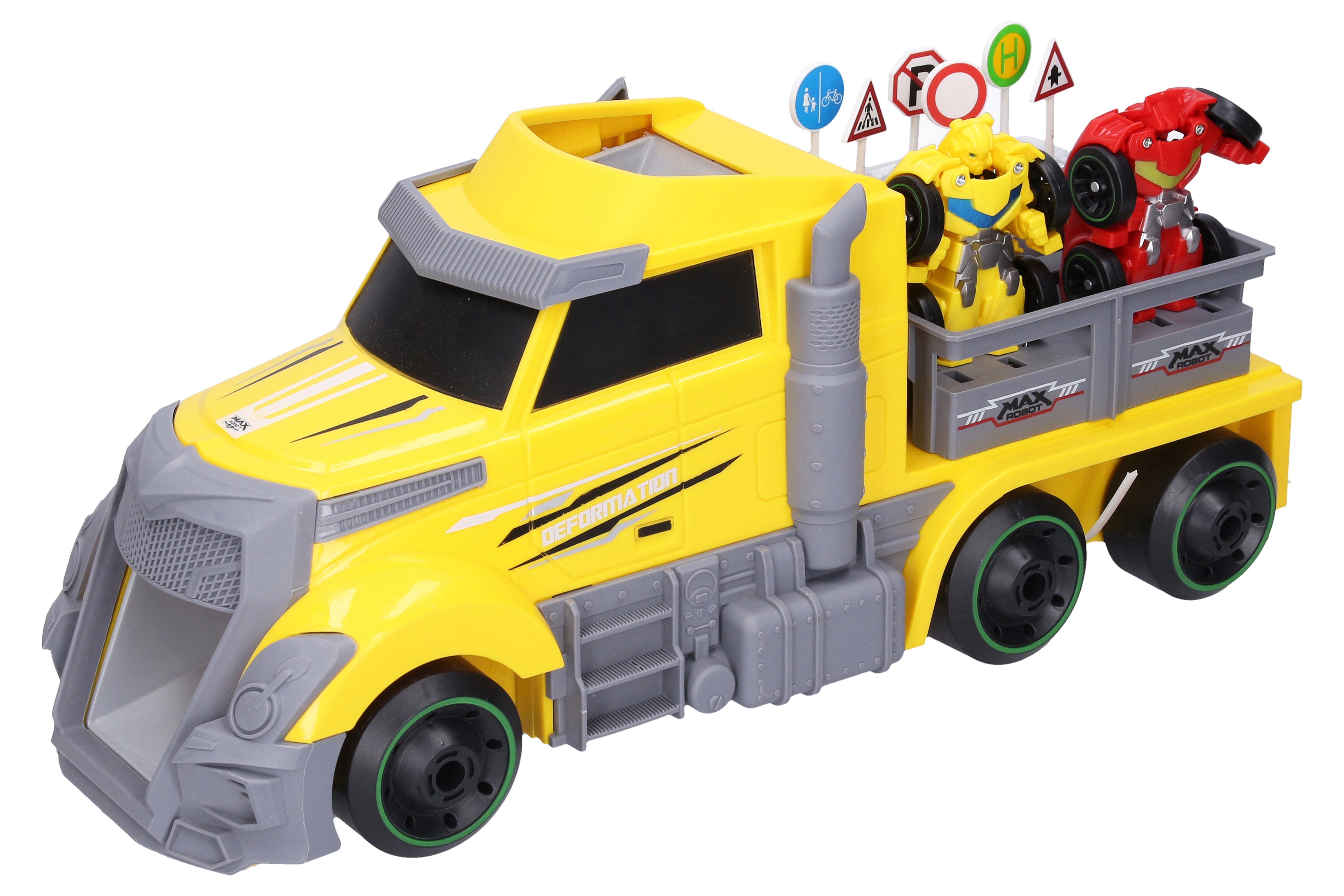 Tahač s autoroboty. Velikost tahače 39 cm, autorobota 7 cm. Volná kola. Součástí tahač, 2 autoroboti, dopravní značky. Autoroboti mohou projíždět skrz kabinu tahače.