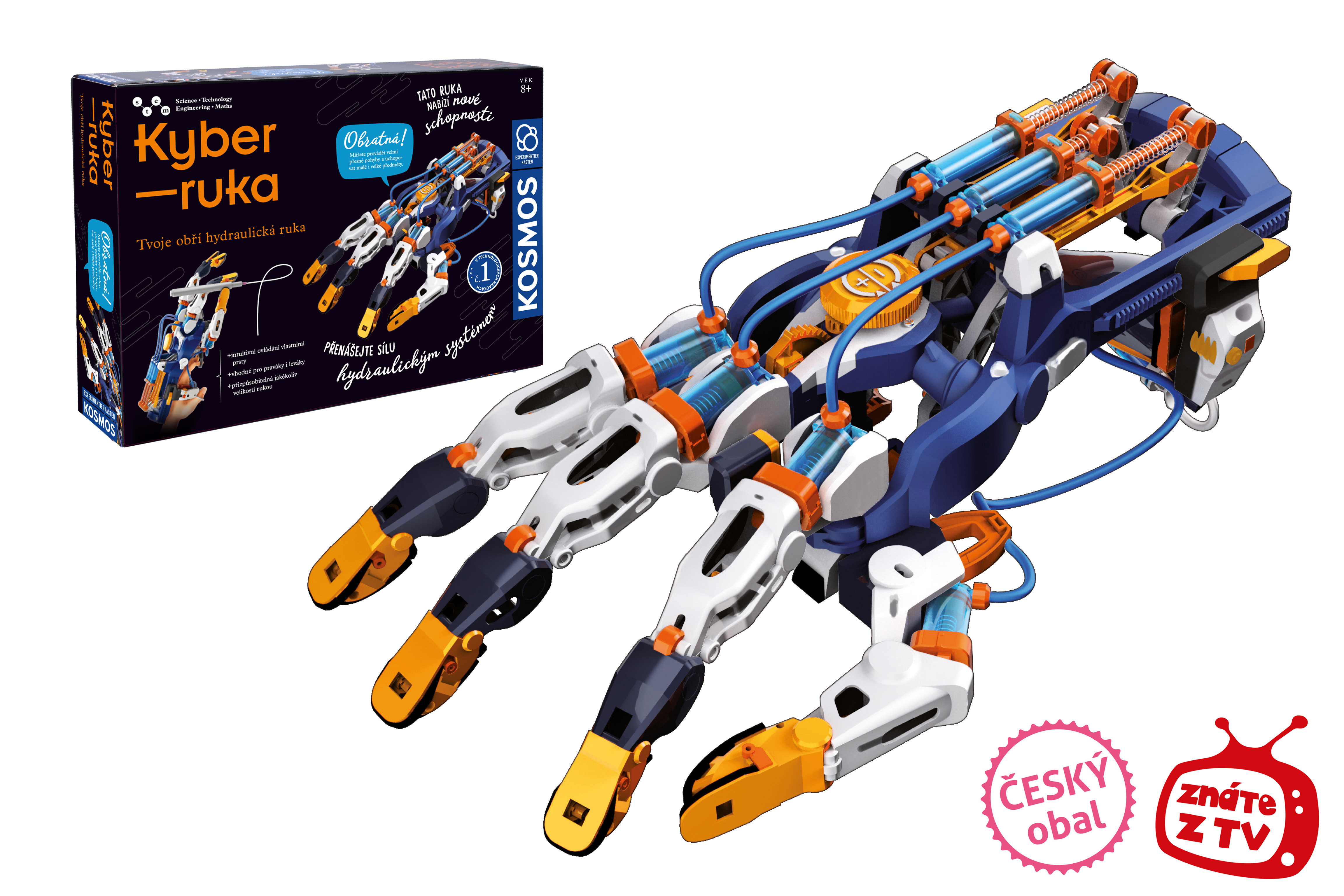 Kybernetická ruka je stavebnice pro šikovné kluky i holky, kteří si chtějí svou hračku sami sestavit a pochopit jak funguje. Kybernetická ruka je jedinečná svou konstrukcí. Kosmos Kybernetická ruka s funkční hydraulikou. Délka 40 cm Ohyb všech 4 prstů je ovládán hydraulickými písty, které jsou plněné vodou. Všechny 4 prsty umožňují ohyb v plném rozsahu. 15 způsobů polohování palce (poloha pravého palce, levého palce a pařátu, každá poloha má pět úrovní otočení). Možnost nastavení horizontálního i vertikálního rozpětí prstů (podle velikosti předmětu, který chcete uchopit). Vertikální rozpětí se nastavuje žlutým otočným ovladačem na horní straně ruky. Horizontální rozpěr se nastavuje přitlačením prstů ze stran k sobě, nebo roztažením od sebe. Posuvné nastavení polohy dlaně pro pohodlné ovládání. Nosnost při uchopení všemi prsty je 600 gramů. Nosnost jednoho prstu je pouze 60 g, proto se nedoporučuje zvedat předměty jen jedním prstem, nebo na ruku cokoliv věšet. Doporučený věk je 7+ s pomocí dospělé osoby, nebo 10+ bez pomoci. Ruku zvedejte pouze za pevné části, netahejte za hadičky s vodou. Pokud se v pístech objevují vzduchové bublinky, nebo v nich není dostatek vody, je možné je jednoduše z ruky odepnout a přes hadičku vodu doplnit. Barevný návod na složení se nachází v balení.