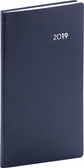 Kapesní diář Balacron 2019 v modrém provedení. Povrch diáře si získal oblibu díky kvalitnímu svrchnímu materiálu, který je extrémně odolný vůči vnějšímu poškození.