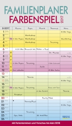 Praktischer Familientimer mit 5 Spalten und frischem Design. Jede Woche in einem anderen modernen Farbton für noch mehr Übersichtlichkeit. Mit Müllspalte, Ferienterminen und Vorschau bis März des Folgejahres. Kalendarium deutsch.