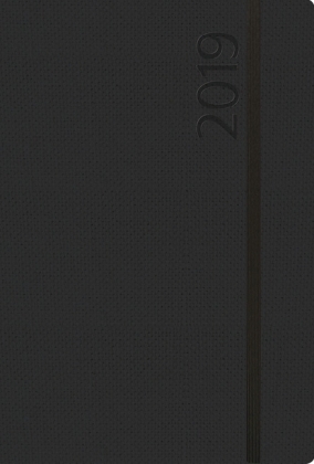 Moderner Buchkalender mit schwarzem Einband. Umschlag aus edlem Strukturpapier. Pro Woche 1 Doppelseite. Mit deutschem Kalendarium und Jahresplaner für 2019 und 2020.
