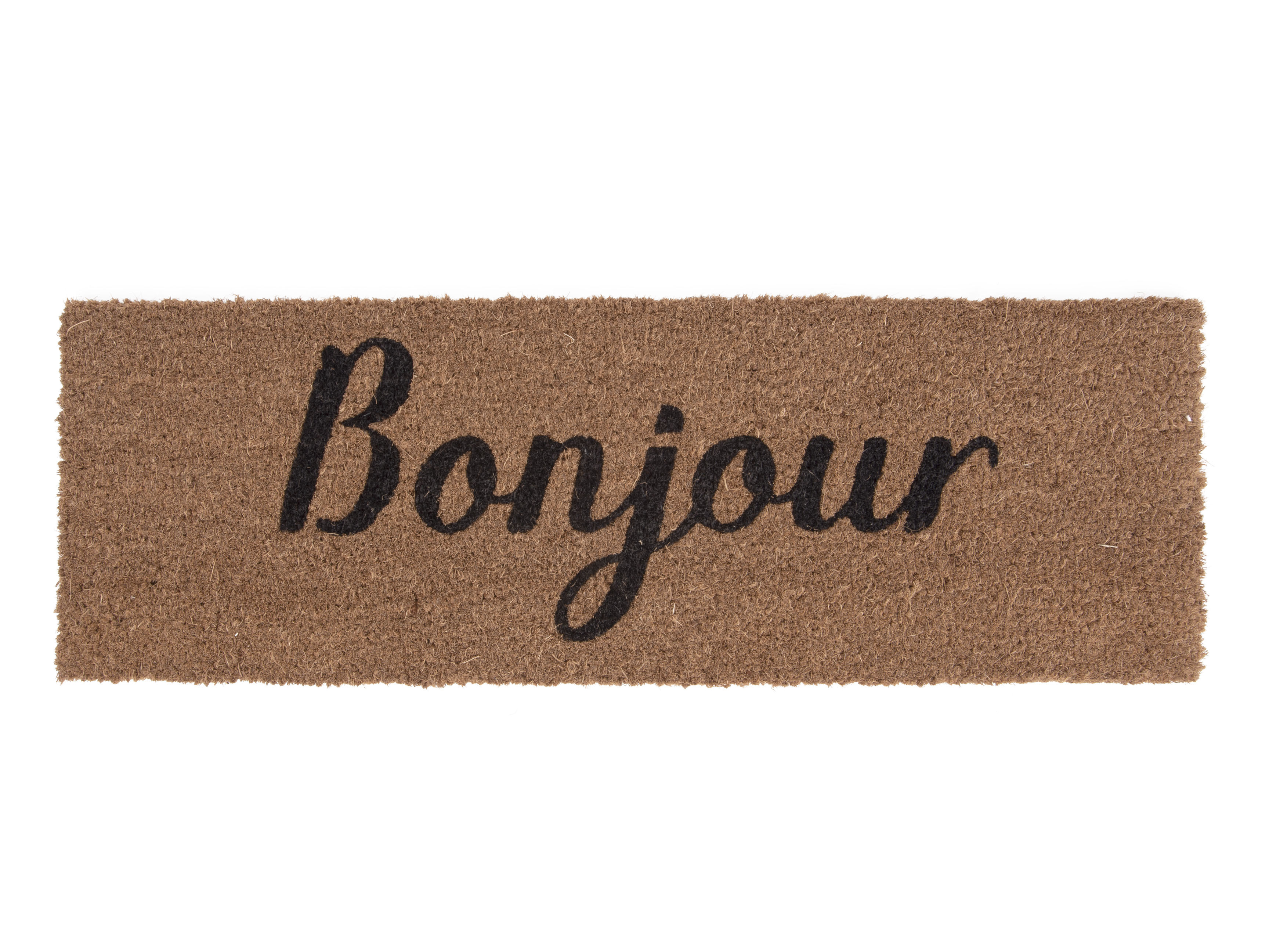 Rohožka v hnědé barvě s černým nápisem Bonjour.