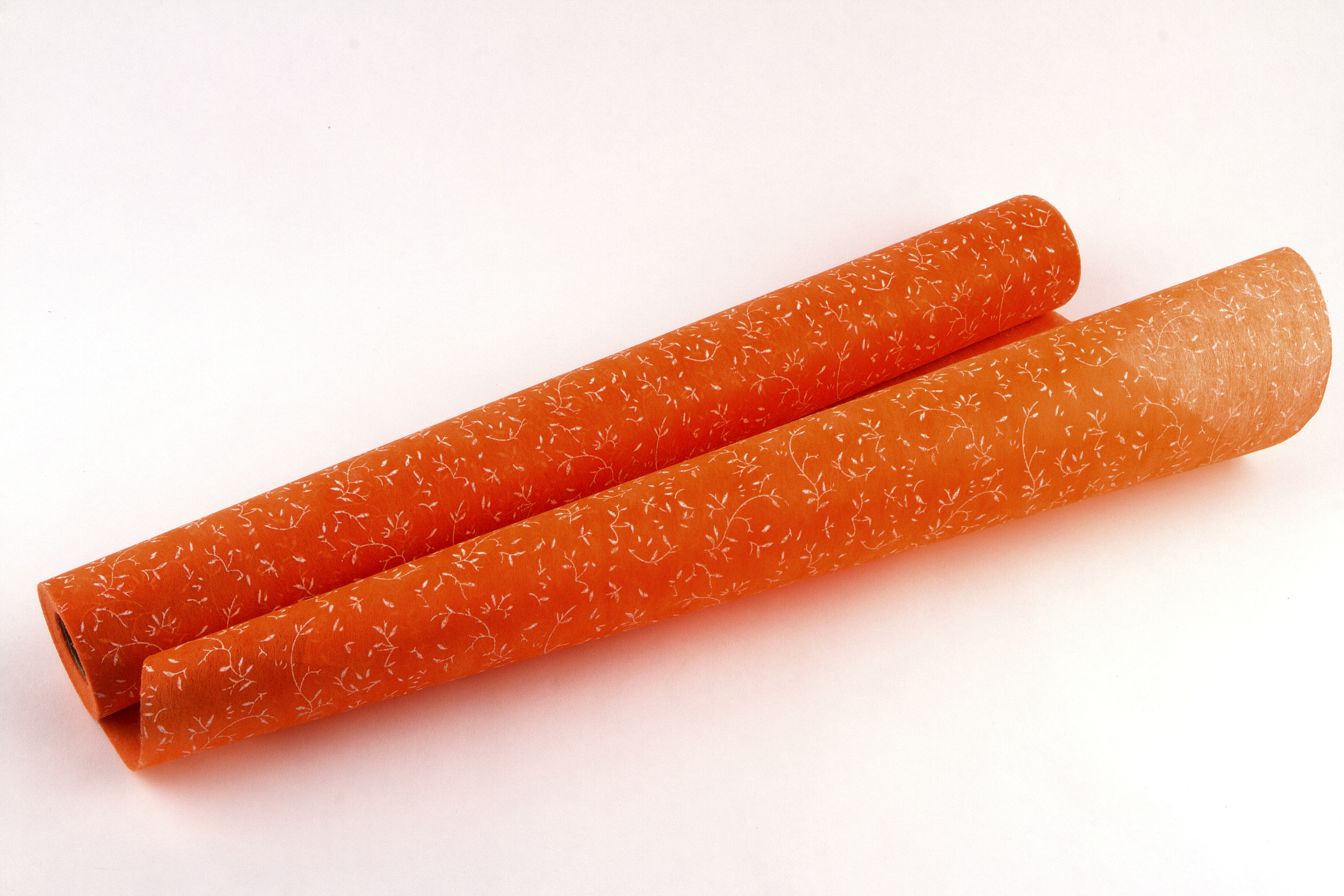 Oranžový 50 cm široký vlizelín s jemným vzorem natištěných bílích lístečků na roli. číst celé