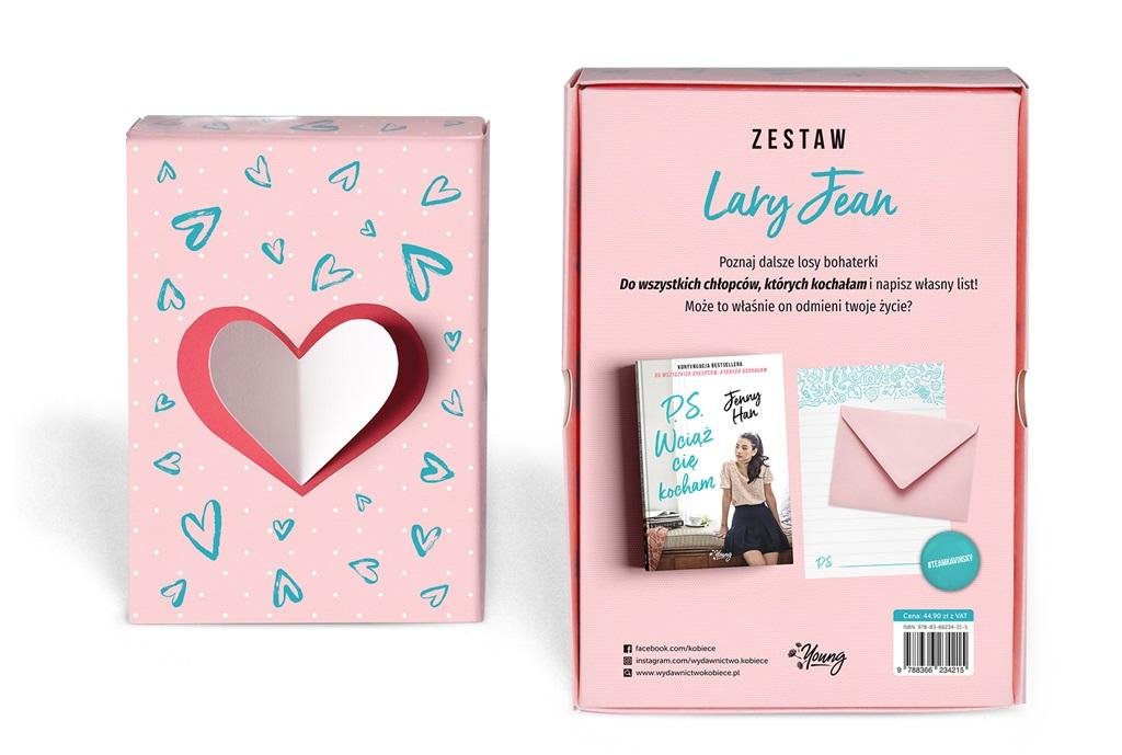 Zestaw Lary Jean dla największych fanów hitu Do wszystkich chłopców, których kochałam. Poznaj dalsze losy bohaterów i napisz własne listy! Zestaw zawiera drugi tom serii o Larze Jean, pod tytułem P.S. Wciąż cię kocham, przepiękny papier listowy oraz koperty, które posłużą Ci do napisania swoich listów, oraz przypinkę #TeamKavinsky! Całość znajdziesz w uroczym, kolorowym pudełku, w którym będziesz mogła przechowywać swoje listy i inne tajemnice. Sekretem udanego związku jest miłość, szczerość i bezgraniczne zaufanie. Jednak kiedy Peter spędza zbyt dużo czasu z Genevieve, swoją ex, Lara Jean robi się podejrzliwa. Chłopak utrzymuje, że to tylko przyjaźń, ale Lara Jean nie jest tego taka pewna. Na dodatek do jej życia wraca John Ambrose, piąty adresat miłosnych listów, który nie ukrywa, że dziewczyna mu się podoba. Nagle we wciąż świeżym związku Lary Jean i Petera robi się bardzo tłoczno. Rozwiązaniem problemu wydaje się zabawa z dzieciństwa, w którą wszyscy postanawiają zagrać. Jeżeli Lara Jean wygra, Genevieve będzie musiała zostawić Petera w spokoju. Tylko czy dziewczyna wciąż chce, aby coś ją łączyło z tym chłopakiem?