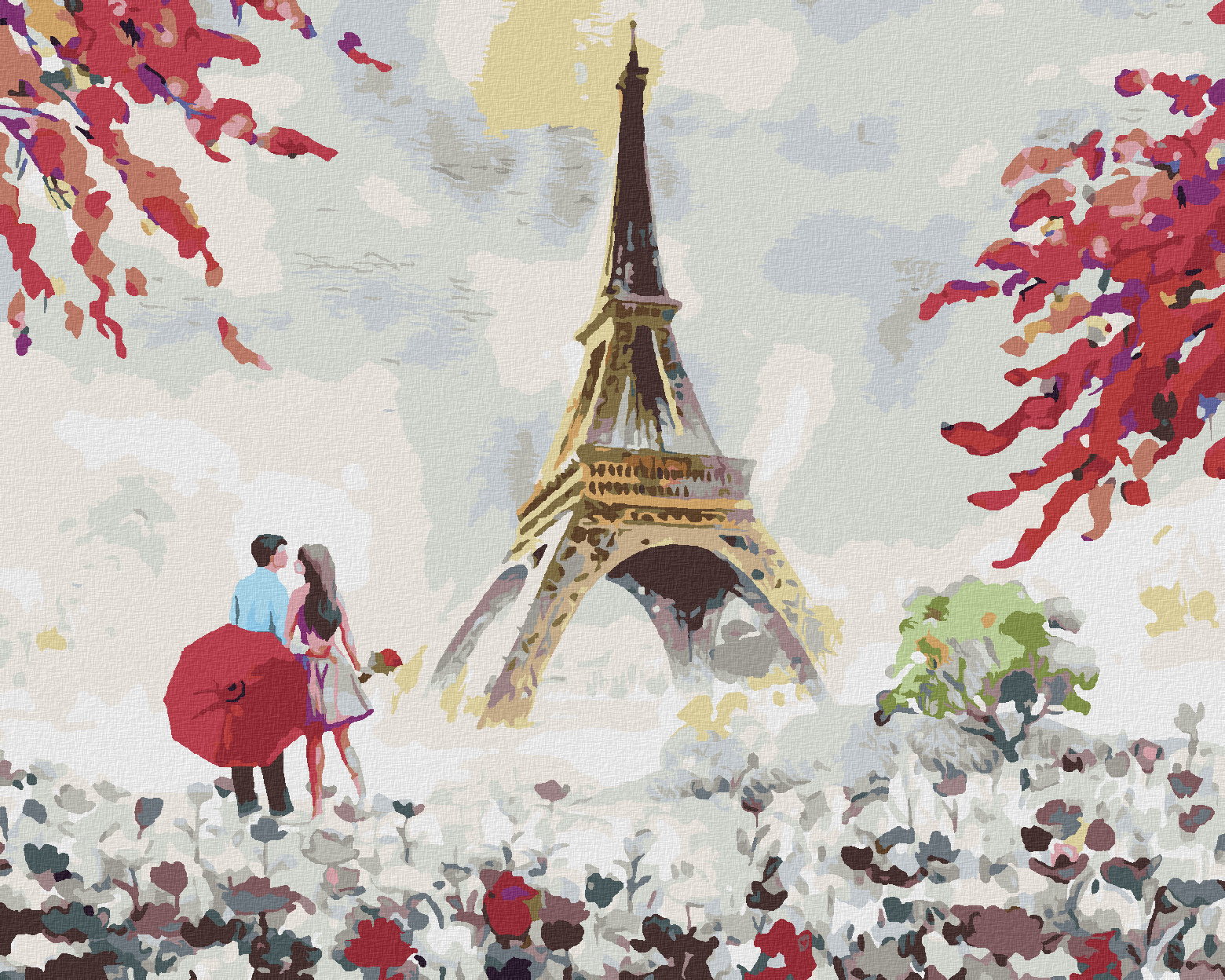 Malování podle čísel - EIFFELOVA VĚŽ A ŽENA S KVĚTINAMI - 40x50 cm, vypnuté plátno na rám