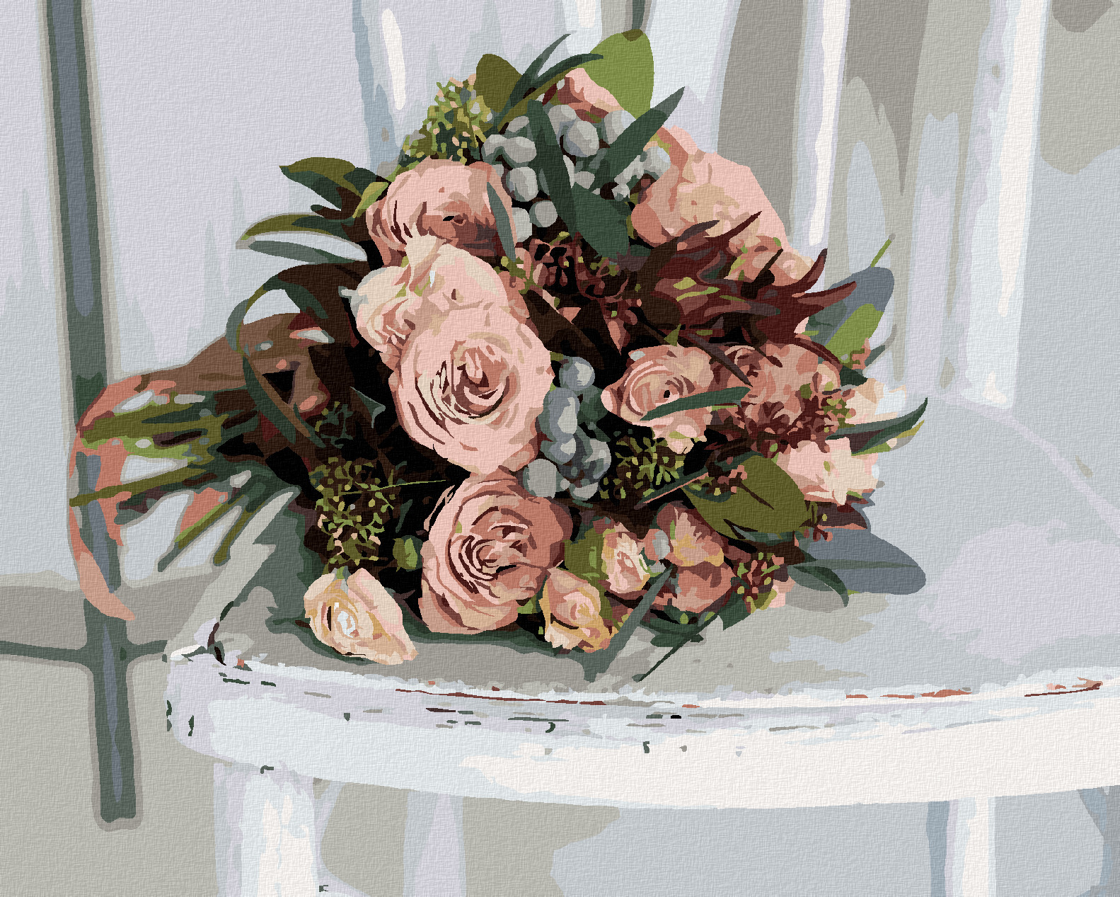 Malování podle čísel - KYTICE RŮŽÍ NA BÍLÉ ŽIDLI - 80x100 cm, bez rámu a bez vypnutí plátna