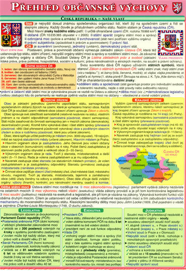 Přehledně zpracované učivo základní školy zahrnující mimo jiné právo, etiku, ekonomii. Přehled mimo jiné obsahuje státní svátky ČR, mapku členění ČR do krajů, 20 grafických ilustrací číst celé