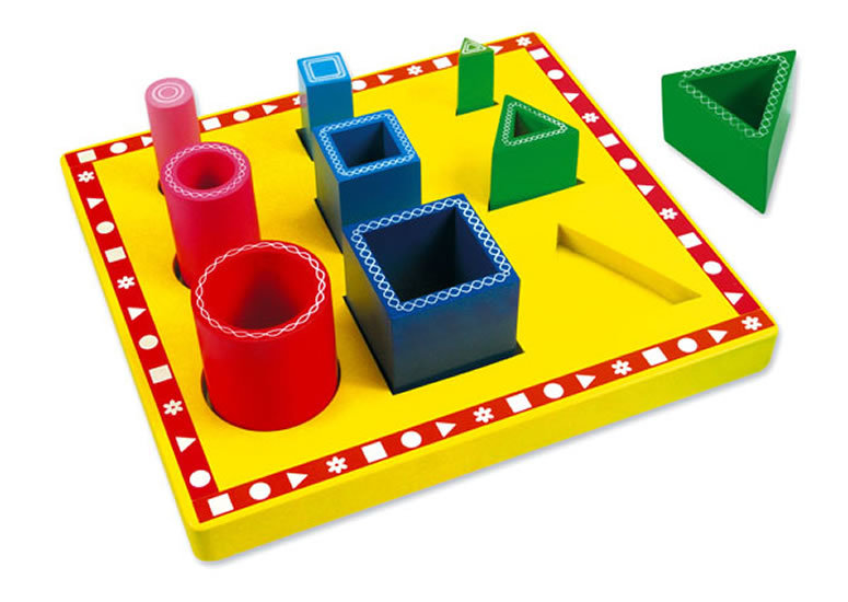 Podložka s výřezy pro vkládání základních tvarů v různých velikostech, k rozvoji psychomotoriky v pestrých barvách. Rozměry 24x22x7 cm.