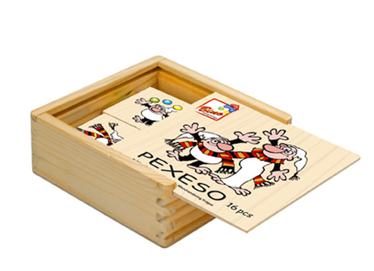 Zábavní skřítkové Křemílek a Vochomůrka na obrázcích dřevěného puzzle. Klasická hra, která rozvíjí paměť s veselými obrázky na dřevěných kartičkách.