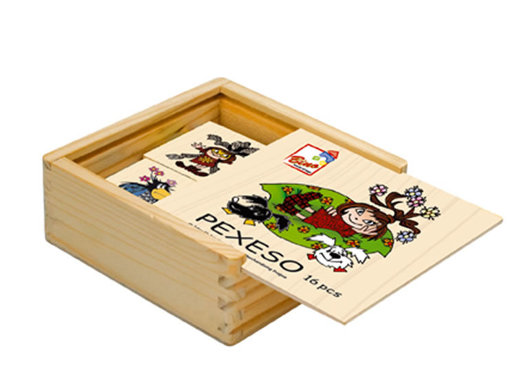 Tradiční hra, která baví celou rodinu a cvičí paměť. Setkejte se s oblíbenými motivy kamarádů, které znáte z televizních pohádek - Malá čarodějnice se Štaflíkem a Špagetkou se na Vás těší v netradičním dřevěném provedení. 16 ks v krabičce.