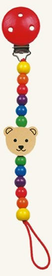 Šňůra na dudlík. Dřevěný, pestrobarevný přívěsek na dudlík s medvídkem. První dřevěná hračka našich nejmenších. Barvy jsou testované a nezávadné.