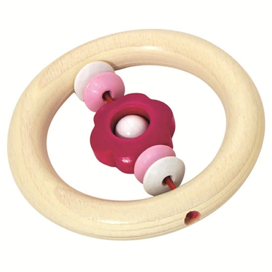 Krásný dřevěný kroužek Fiona je vhodná jako jedna z prvních hraček pro kojence okolo šesti měsíců, má dobrý tvar pro první úchopy a zároveň se na něm dobře trénuje přendavání z ruky do ruky. Tato růžová varianta je vhodná pro holčičky. Kojence zároveň lákají korálky umístěné uprostřed kroužku, může s nimi lehce pohybovat. Kroužek se dá také kousat, je vyroben z nezávadného materiálu (výrobce osvědčená společnost BINO).
