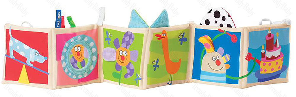 Textilní leporelo je vhodné do většiny kočárků i postýlek. Oboustranné provedení je určeno pro dvě věkové skupiny. Pro věk 0-3 m: Strana 1 s vysoce kontrastními barvami a vzory, veselé jednoduché obrázky pomáhají vývoji smyslů a emoční inteligence dítěte. Pro věk od 3 měsíců: Strana 2 s veselými obrázky ve výrazných barvách s různorodými texturami, které stimulují vývoj smyslů a jemné motoriky dítěte. Nerozbitné zrcátko, našité šustící části pro uchopení a zkoumání. Dva unikátní plastové klipy pro snadné připevnění do kočárku.